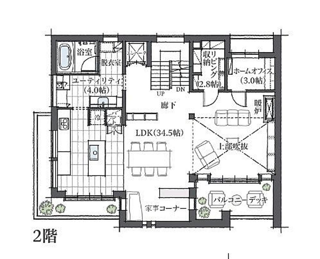 土間リビングは皆が気軽に出入りでき、お酒を飲んだり談笑したりとのんびりと寛ぐことができる空間です。
