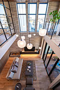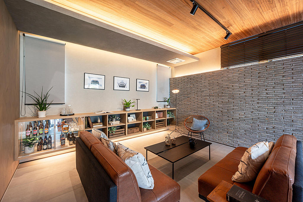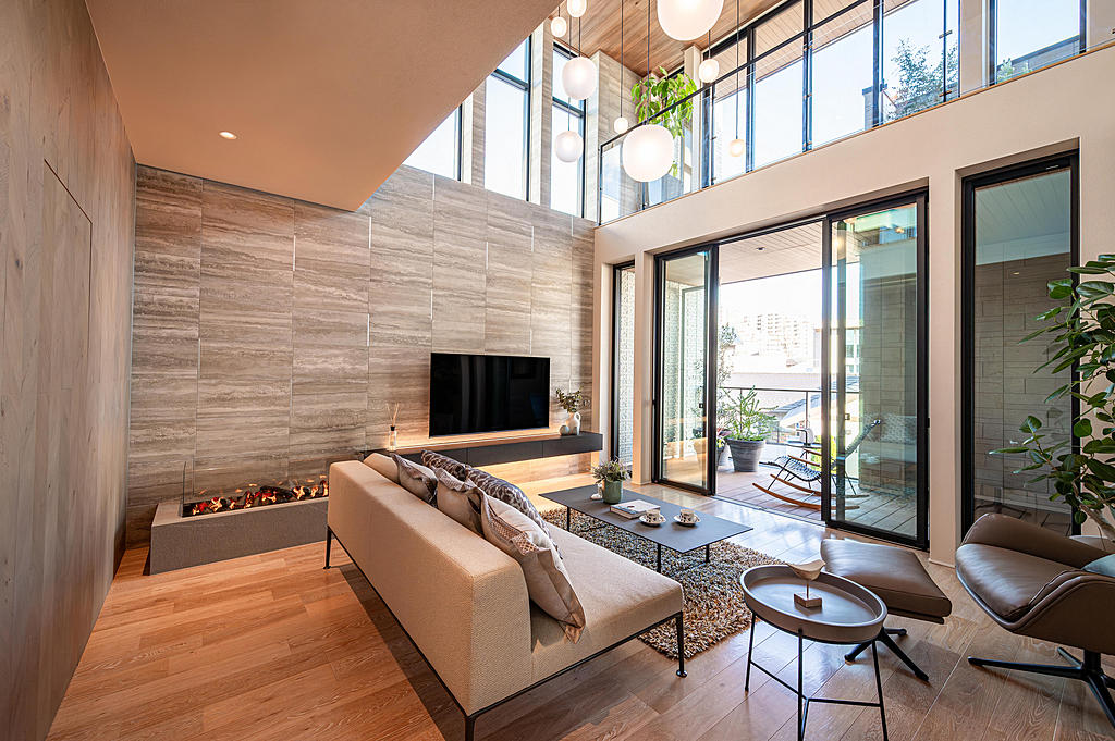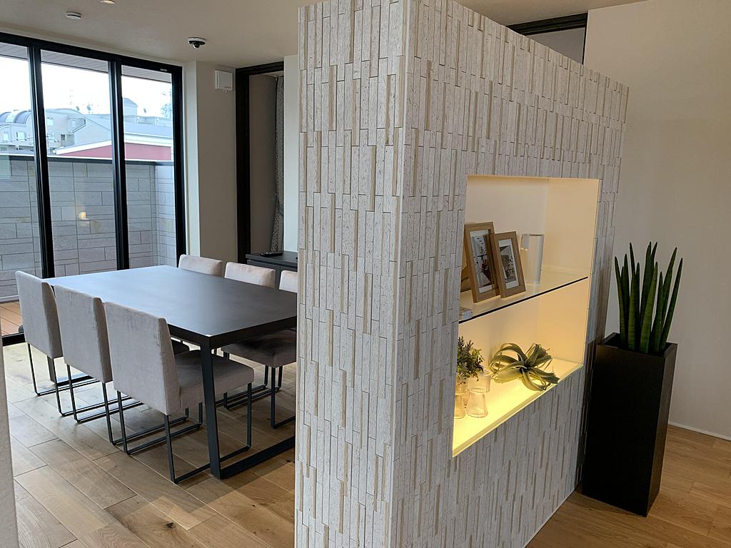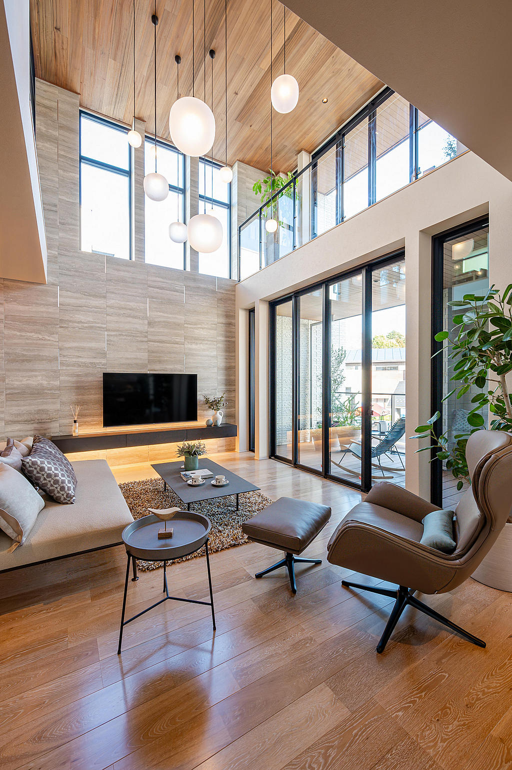 上部からの日差しを受けるリビングは壁面にデザインされた壁タイルを貼り重厚感を演出しています。