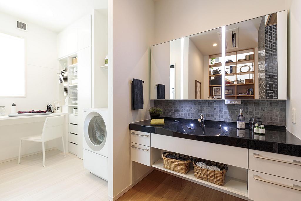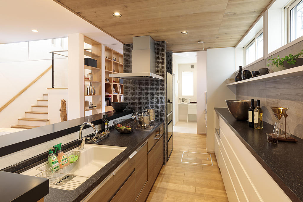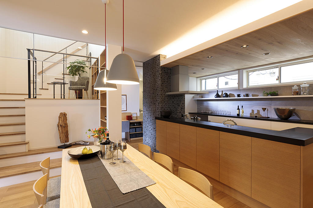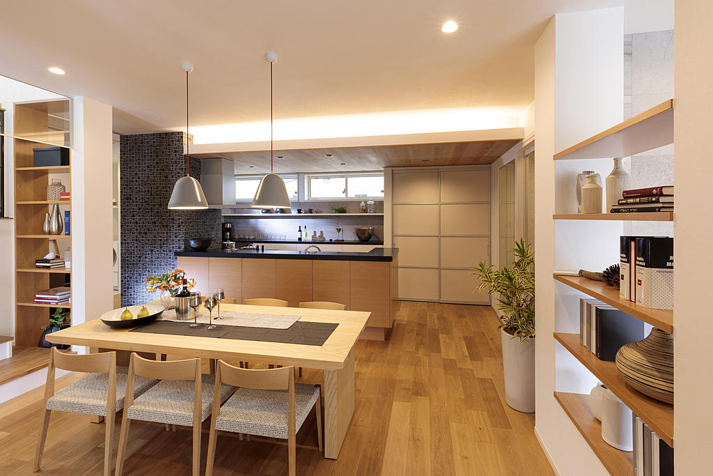 家族が毎日コミュニケーションを取りながら生活できる空間になっております。適材適所に収納を設(shè)け、実際の生活スタイルがイメージできます。動(dòng)線の中のアイストップには、タイルなど表情を変えた空間が家族を楽しませます。また、天井高2,720mmやロースタイルリビング?折り上げ天井による3,160mm天井高にボルダリングと見(jiàn)どころ満載の展示場(chǎng)になっております。