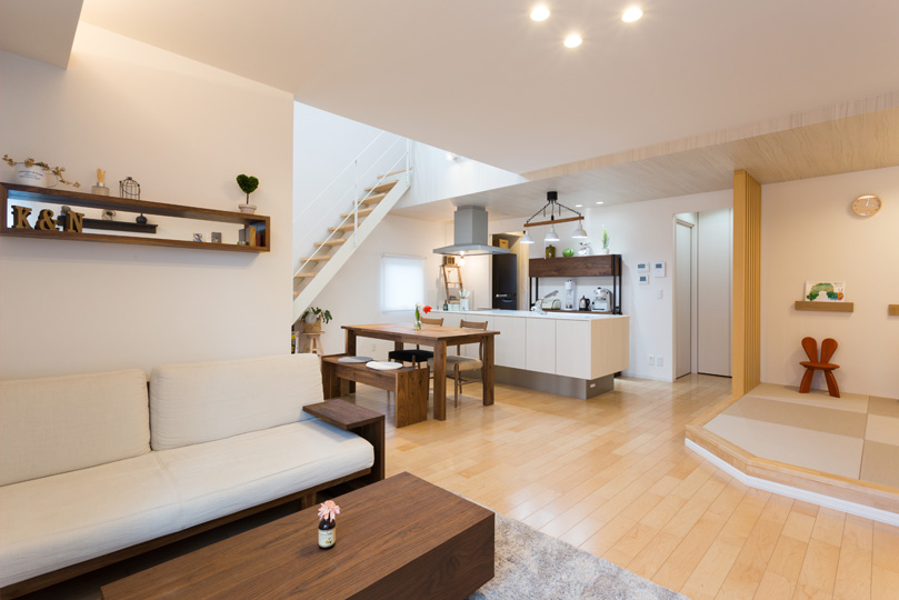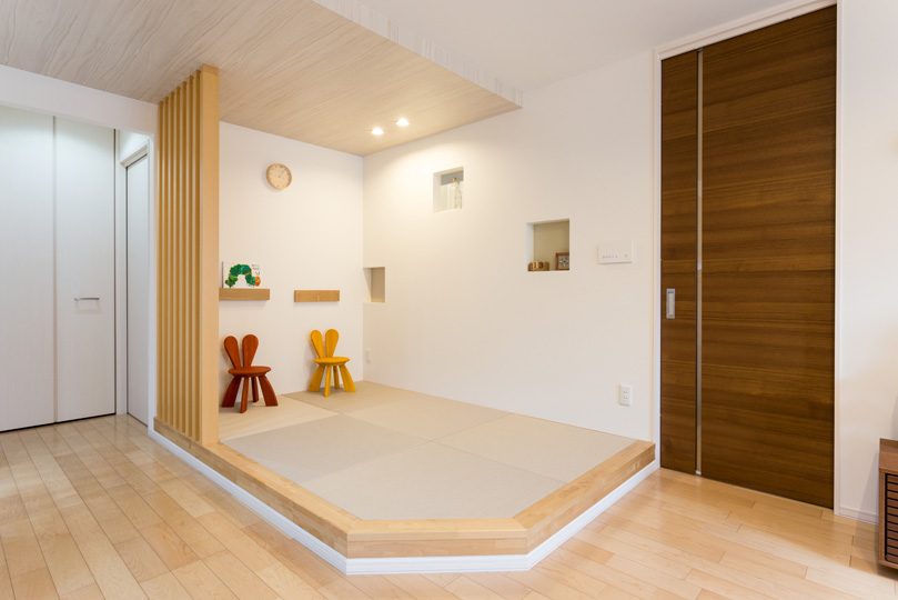 LDKの一角に、橫になってひと休みできる小上がりのタタミスペースを設けました。子ども部屋と同様に色分けした壁のニッチは、畳に座った目線と立った目線、LDKに立ったときの目線に合わせた高さに。雑貨を飾るのがより楽しみになる細やかな工夫です