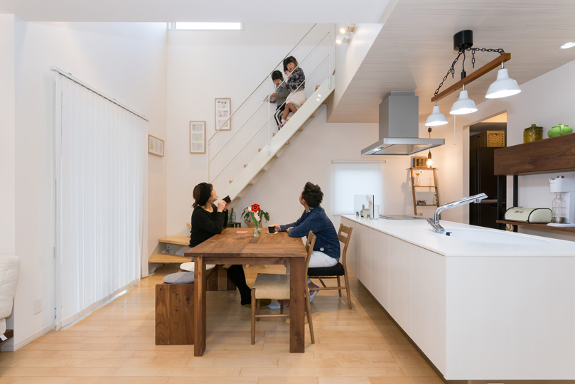 空間を小分けにするのではなく、広くつながっている家にしたいと考えていたご夫妻は、ダイニングの上部を吹抜けにして1階~2階間でコミュニケーションできるように。また、キッチン上部から吹抜けにかけて、木調のクロスを採用。2階のプライベートスペースを、木の上にある「鳥の巣」に見立てています