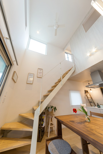 吹抜けに設けた2階への階段は、蹴込みのないライトスルーのスケルトン階段に。上部に設けた大きな窓からたっぷりと光が入るので、明るく快適なLDKを実現できました。「畳コーナーに寢転んでいてもこの窓から空が見え、開放的な気持ちになるんです」(妻)