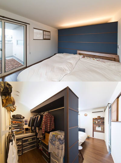 吹抜けに面して小窓をつくり、階下の気配を感じられるようにした寢室。一角を仕切って大容量のウォークインクローゼットを設けましたが、天井まで塞がずに間接照明を入れているので空間に広がりが感じられます。ネイビーのクロスとウォールナット材を使った壁が個性的