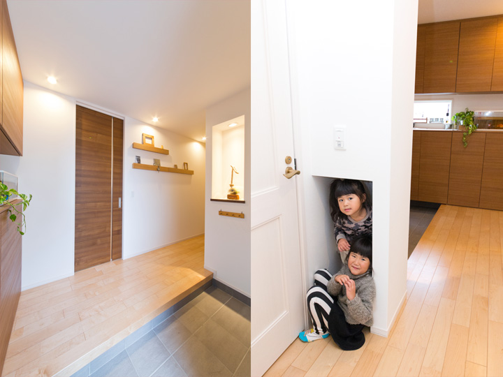 大容量のシューズボックスと土間収納を設けた玄関。壁にはニッチを設け、ディスプレーを楽しむことができるようにしました。「工事中に“反対側にもニッチをつくれるのでは“と思いついて作ってもらったスペースは、娘たちのかくれんぼの場所にもなっています」(妻)