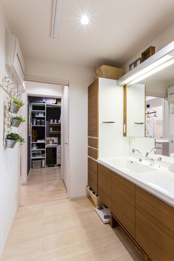 Tさまご夫妻は、スムーズに生活できることを重視されていました。そこで、玄関から洗面室、ウォークインクローゼットを通ってLDKに入ることができる動線を確保。「外から帰ったらまず手洗いうがいをして、著替えてすぐにくつろぐことができて便利です」(ご夫妻)
