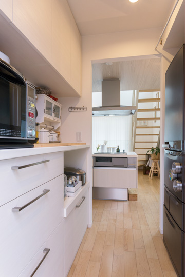 物を人目につくところに出しておきたくないという妻の要望で、キッチンの奧にパントリーを設置。冷蔵庫や調理器具?家電、食器類まですべてしまうことができ、キッチンまわりをいつもすっきりと保つことができるようになりました