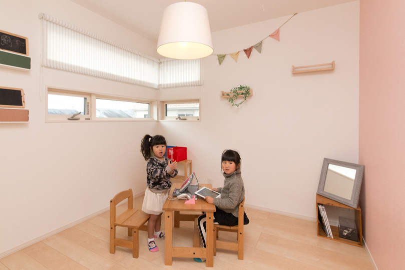 2階には子ども部屋を3室確保。各部屋の壁1面だけ、それぞれピンク、イエロー、グリーンのクロスにし、変化をつけています