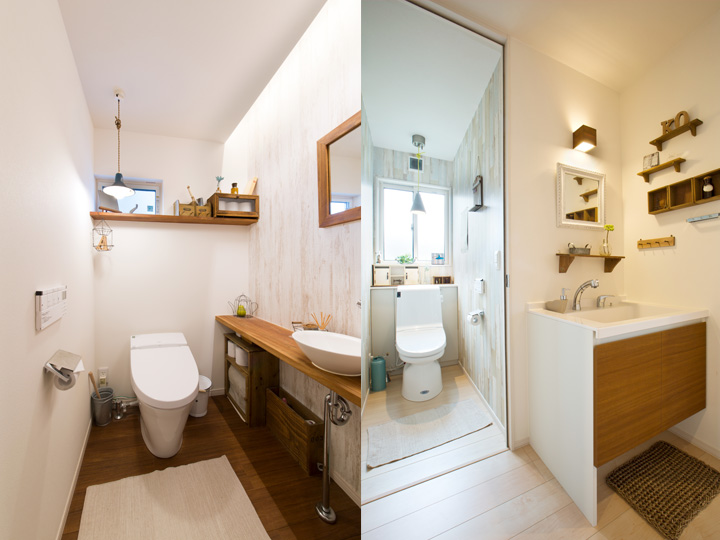 「行きつけの美容室や雑貨屋さんのような雰囲気にしたい」と妻がこだわったトイレ。設計擔當が美容室に出向いて確認し、何枚もスケッチを描いてイメージ通りの空間を完成させました