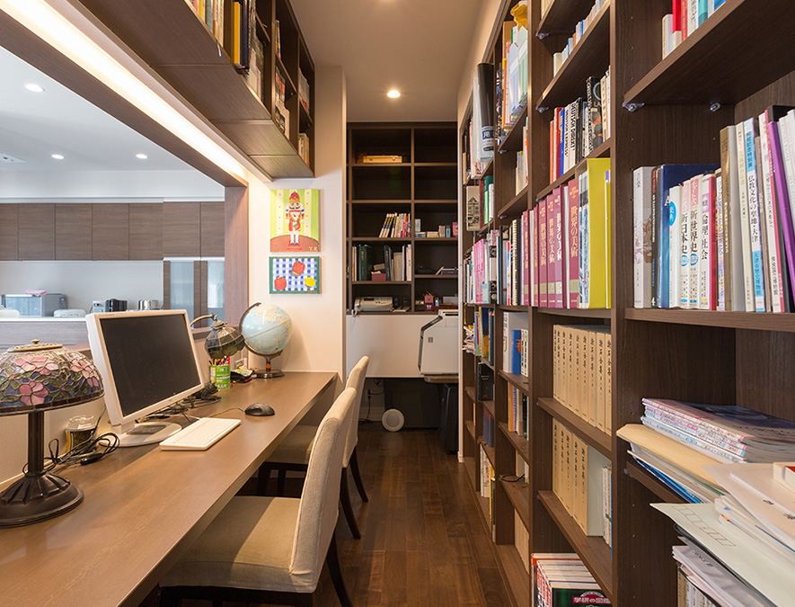 リビング內(nèi)に図書室を兼ねたスタディスペースを