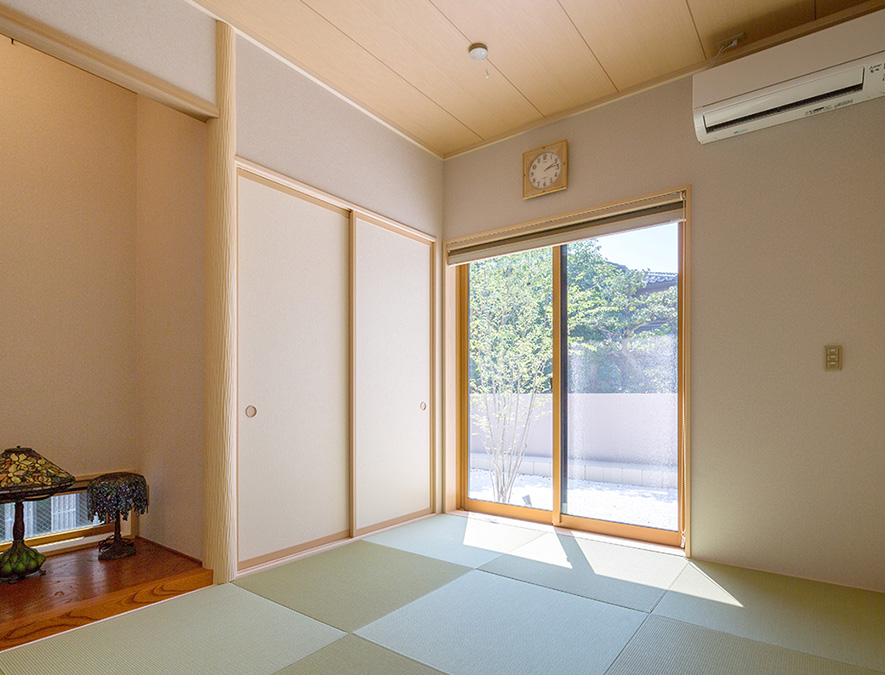 白砂利を敷き詰めた美しい石庭を望む琉球畳のモダンな和室