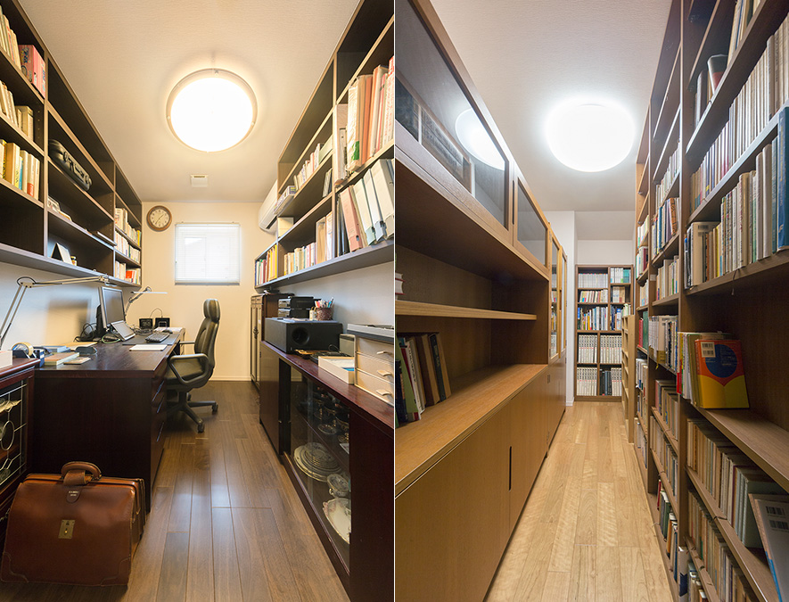Kさま愛用のデスクや家具を美しく収めた書斎スペース。吊り本棚も造り付けに。廊下を挾んだ対面に書庫も設(shè)けて膨大な蔵書をすっきりと収納しています