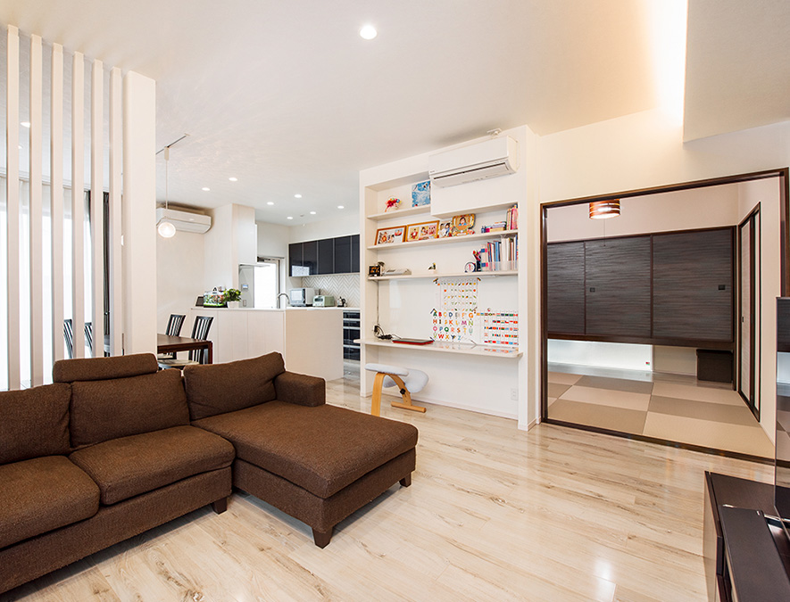 白の木目フローリングが美しいLDK。2m72cmの天井高を生かし、天井面を間接照明で彩りました。和室の橫の壁に本棚と二人のお子さまが並んで座れるカウンターデスクを造作し、勉強スペースに。リビングとダイニングは白い格子壁で視線を通しながら、さりげなく間仕切りしています。
