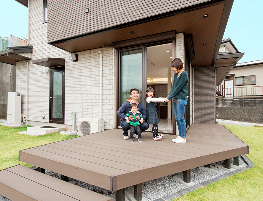 コーナーサッシを囲むウッドデッキはお子さまたちの遊び場