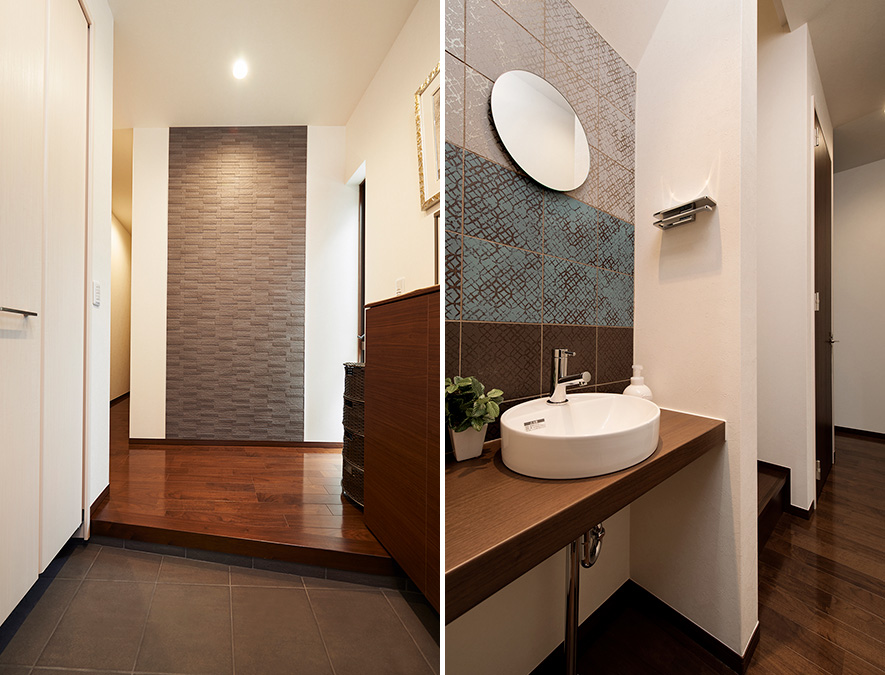 タイル調の調濕壁材を貼ったアクセント壁が映える玄関ホール。右橫のスリット窓から光が明るく差し込みます。また、壁の裏側に設けた手洗いスペースは、デザインタイルでお灑落な雰囲気に。「子ども達は帰宅後、リビングに入る前にここで手洗いする習慣が身につきました」とSさま。