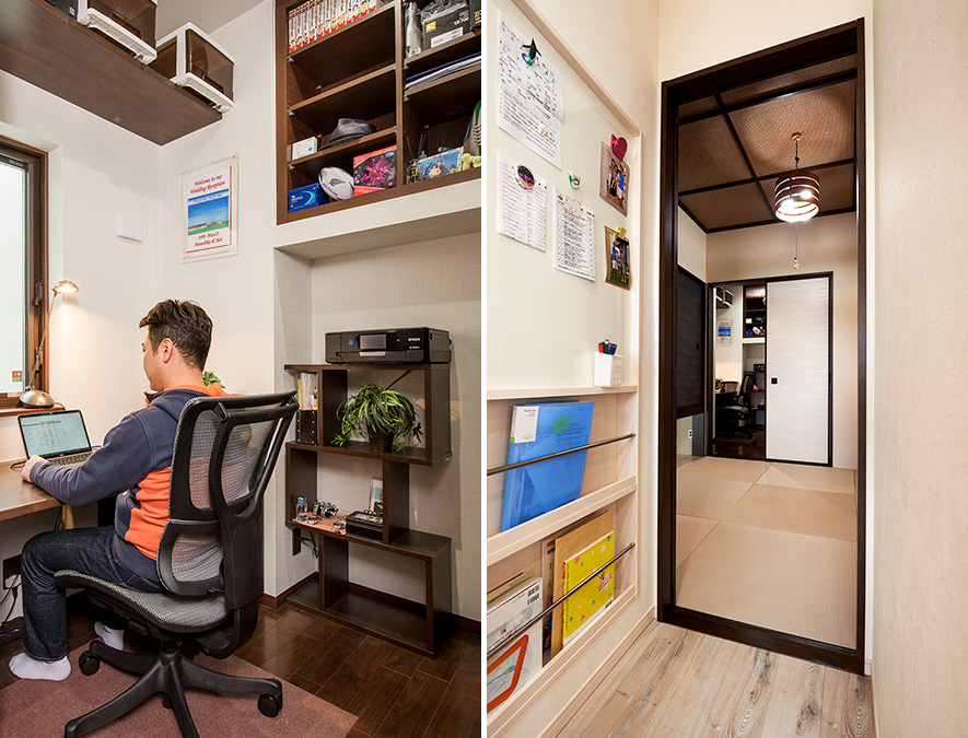 コンパクトながら、カウンターデスクや豊富な収納を備えた個室の書斎スペース。廊下からも和室からも出入りできる2wayの動線で、和室側の扉を開けると、キッチンまで視線が屆き、ご家族の様子がわかります。