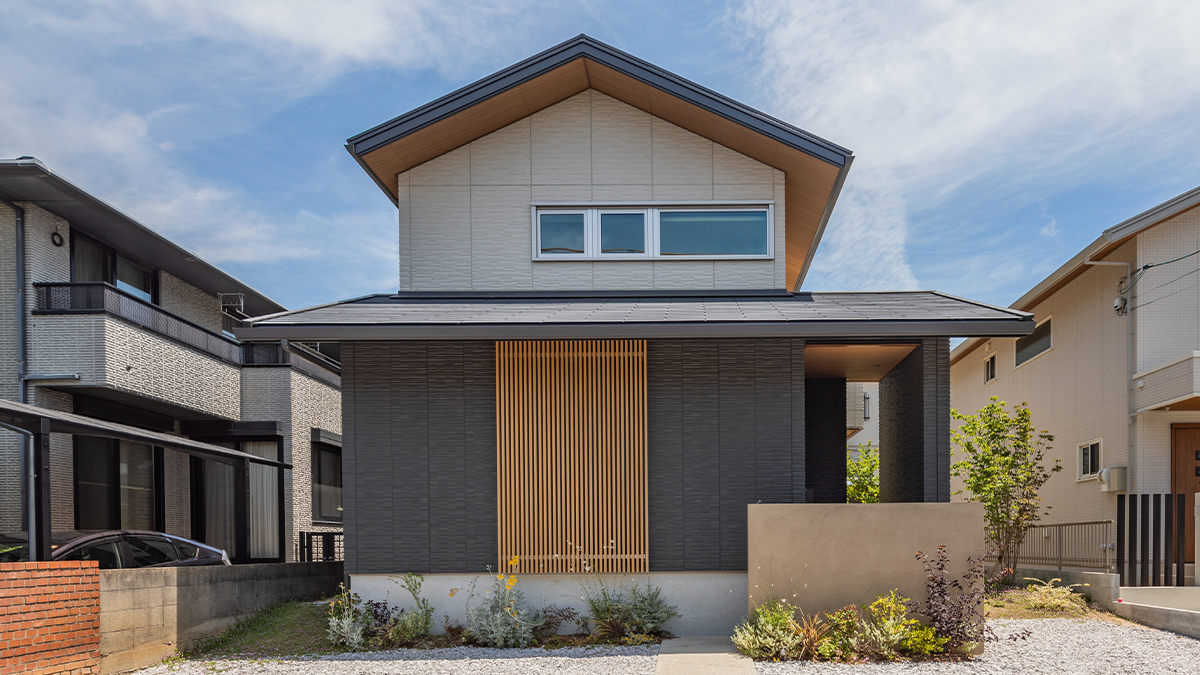 Tさまが建てられたのは、切妻屋根や大きな下屋に木調(diào)格子が情趣を添える和モダンのお住まい。三方を建物で囲まれた住宅地でありながら、LDKに入ると大きな吹き抜けから青空が広がり、思いがけないほどの開放感と明るさに包まれます。共働きのご夫妻は生活動線にも配慮し、家事が無駄なくスムーズにこなせる暮らしを?qū)g現(xiàn)。「回遊動線だから、子どももグルグルと走り回れて楽しそうです」と目を細(xì)めるTさまです。