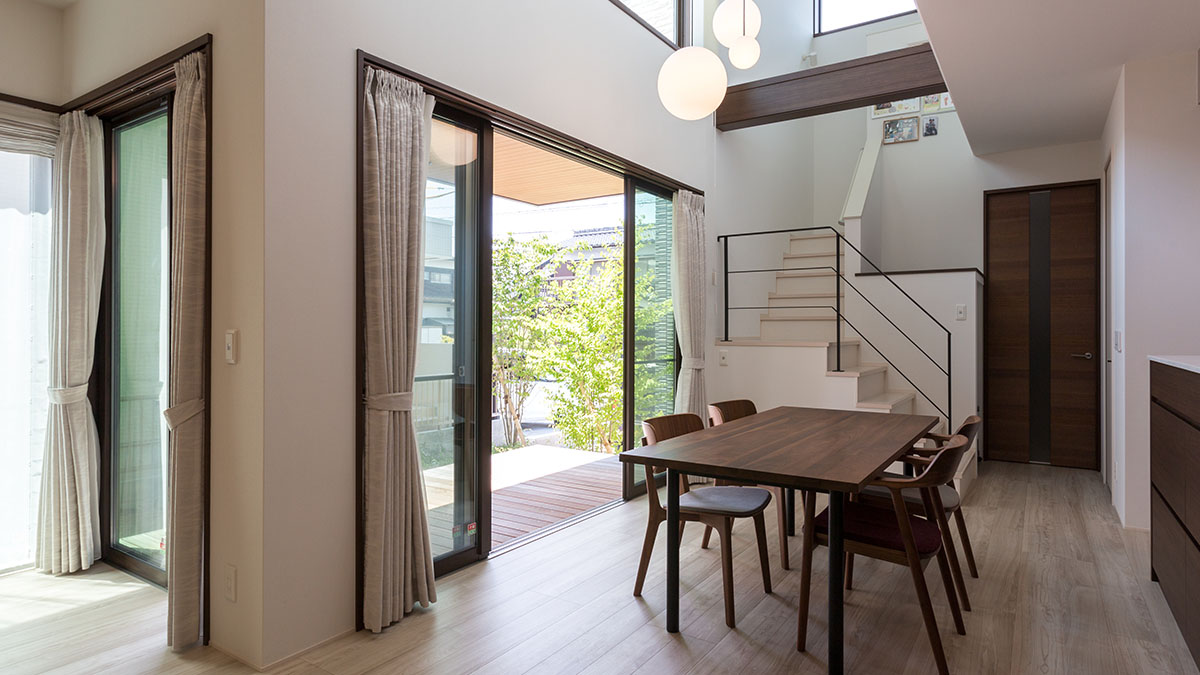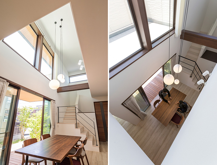 ダイニングを吹き抜けにして1?2階をつなぎ、明るく開放的な暮らしを?qū)g現(xiàn)。吹き抜けの大きな窓から光がふんだんに差し込み、家のどこにいても家族の気配が感じられます。階段のアイアン手すりがインテリアのアクセントに。