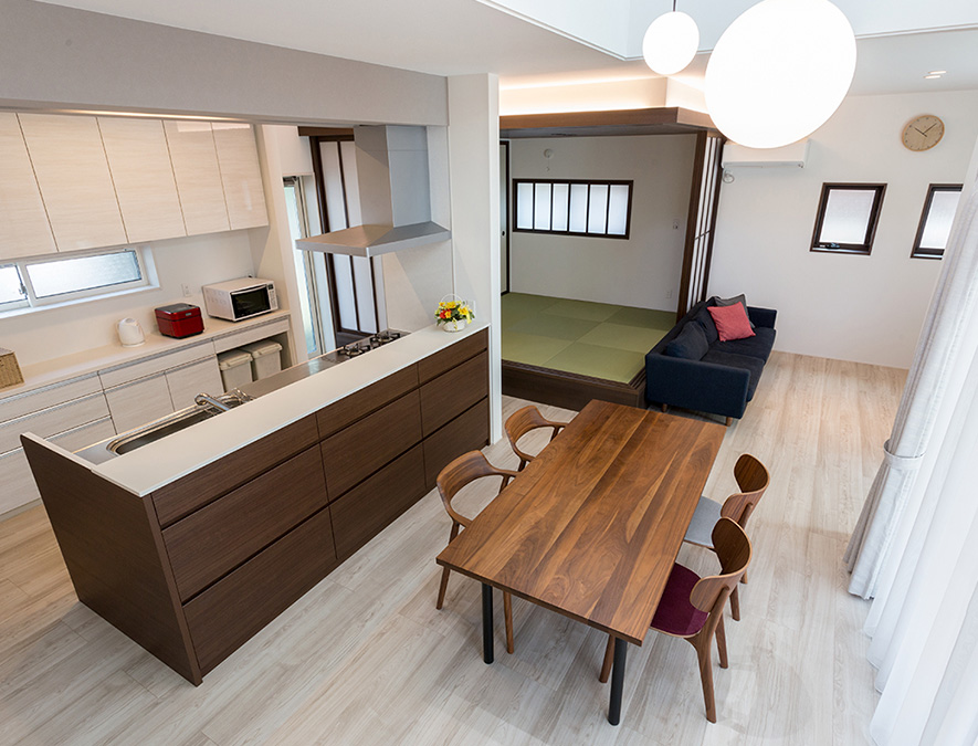 グレイッシュな床にウォールナット色のキッチンが映えるLDK。リビングの隣に和室もしつらえて、和のくつろぎ感も味わえるようにしました。キッチンのスマートビューカウンターには、ダイニング側(cè)の収納に小物がたっぷりとしまえます。