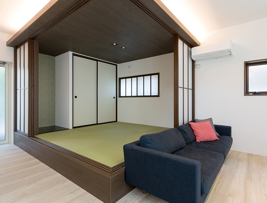 小上がりの和室はTさまご夫妻のお?dú)荬巳毪辍x喚婴伍g接照明が柔らかな光で空間を彩ります。普段はお子さまの遊び場やお晝寢の場として大活躍。モダンなデザインの障子を閉めると客間として使えます。