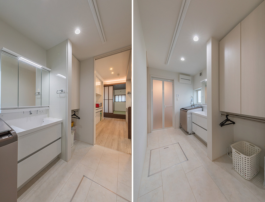 清潔感あふれる「白」の洗面室。キッチン、洗面室、玄関へとつながる回遊動線も便利です。「料理、洗濯、お風(fēng)呂洗いが直線移動でこなせるので、家事がスムーズになりました」とTさま。お子さま達(dá)は帰ると玄関から洗面室に行き、手を洗う習(xí)慣が身についたそう。