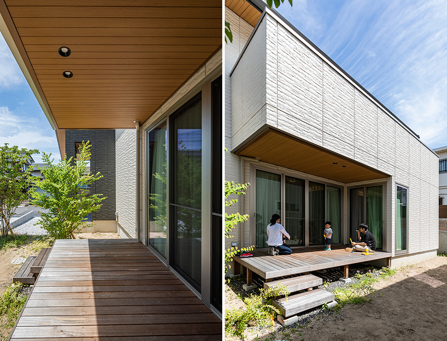 深い軒に守られたウッドデッキはお子さま達(dá)の遊び場