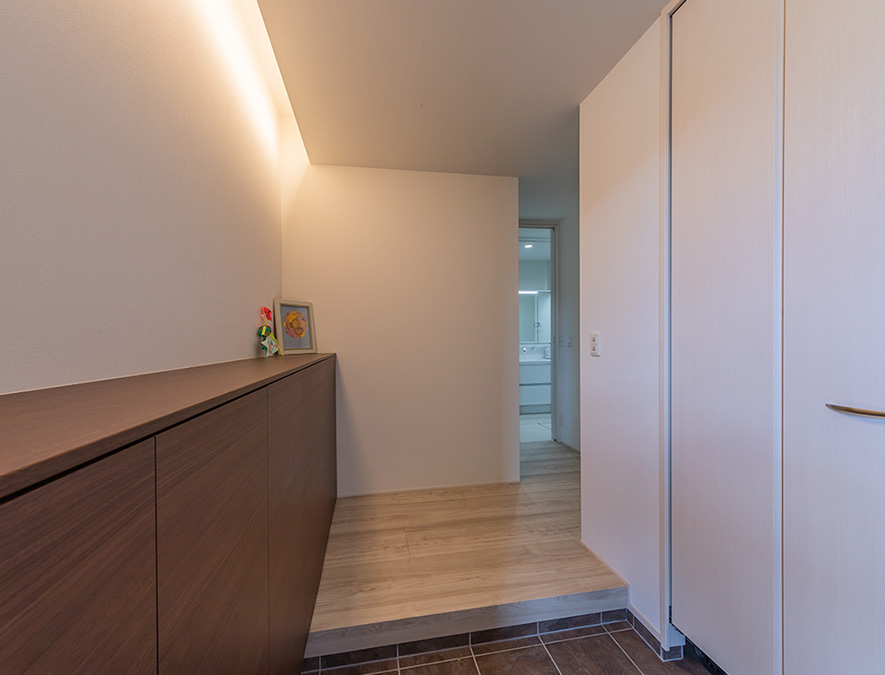 間接照明が美しい玄関ホールは収納力もたっぷり