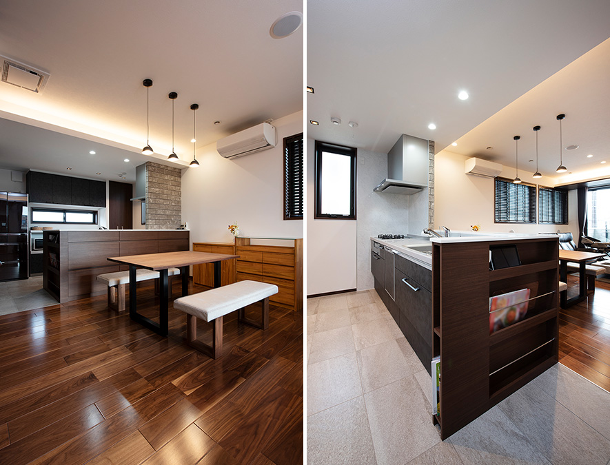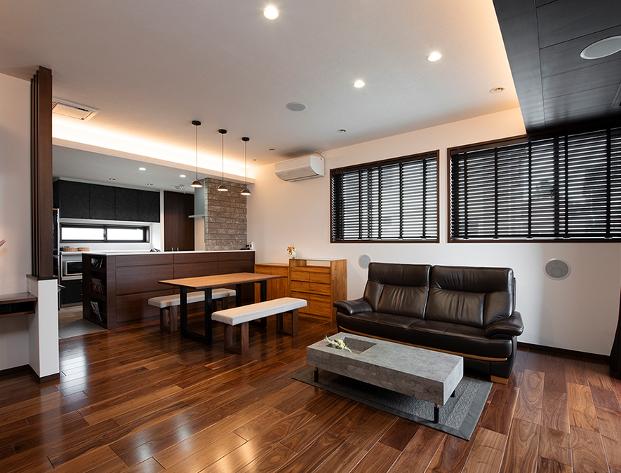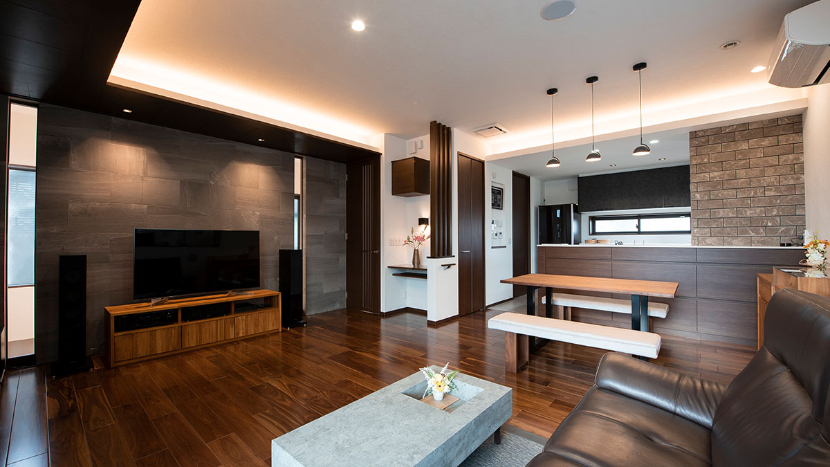 ダークウォルナットを基調にタイルや光の効果で上質なくつろぎ空間を演出