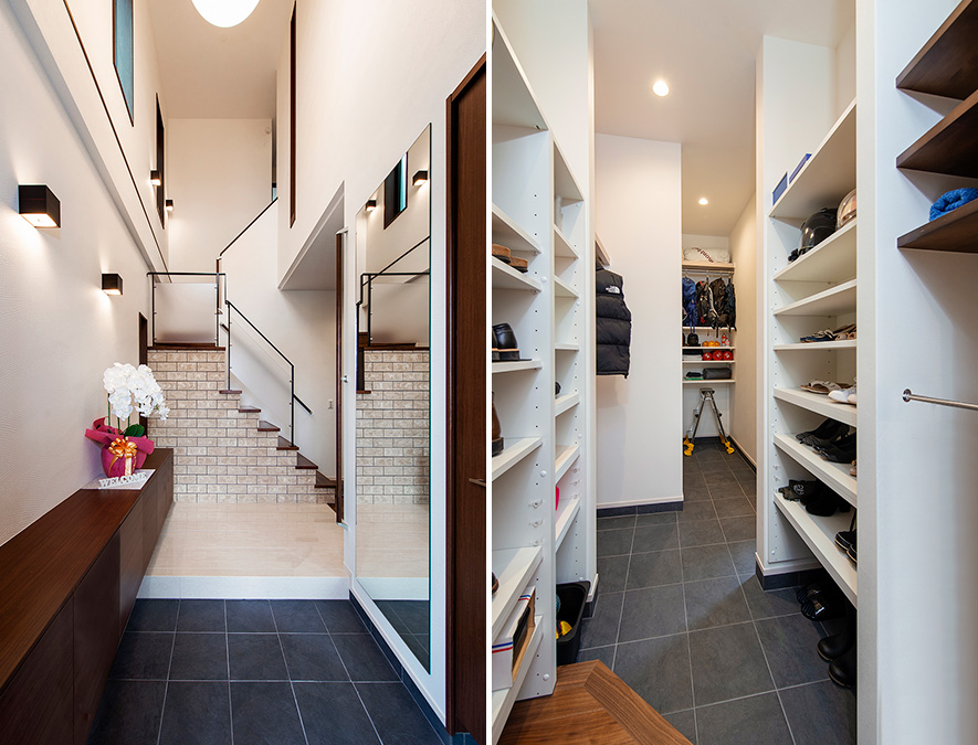玄関ホールは吹抜けにして階段を配置。床に大理石調のタイルを合わせ、階段の壁には、形狀に沿って丁寧にタイルを張ってエレガントな空間に?!弗ぅ岍`ジ通りでとても気に入っています」とIさま。玄関収納にはご夫妻の趣味である登山の道具類をスッキリとしまわれています。