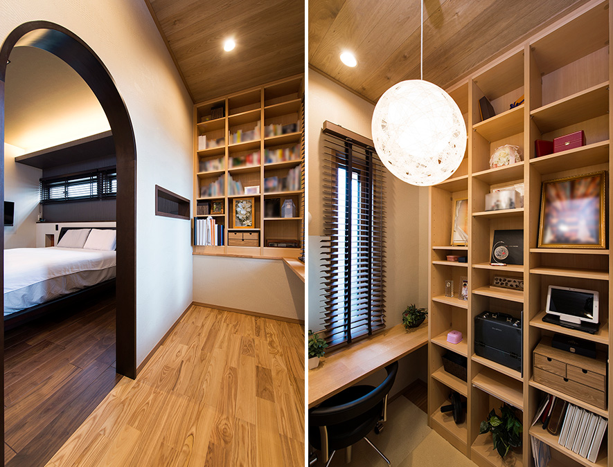 寢室からアール型の開口部をくぐると、山小屋風の書斎スペースにつながります。書籍はもちろん、登山の記念に集めているバッチなどを飾れる趣味の空間に。「化粧コーナーとしても使っているのですが、居心地がよく毎日ここに來るのが楽しみです」。