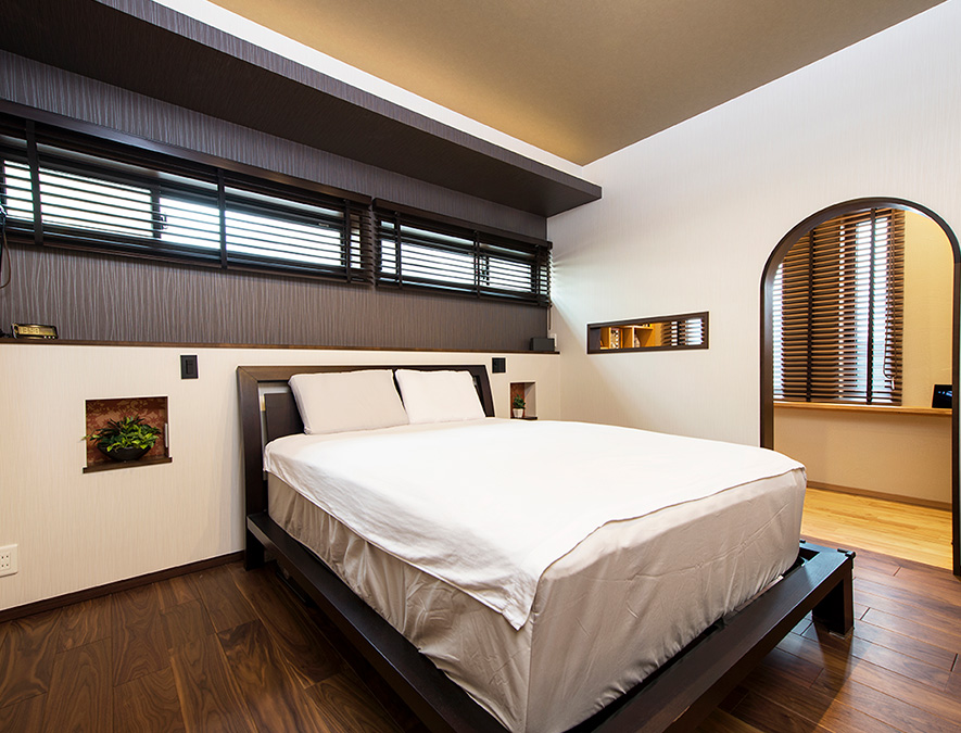 ホテルライクなくつろぎ感が心地いい寢室。一面の壁のクロスをツートーンにして間接照明を取り入れたほか、小さなニッチには、お気に入りのクロスを合わせるなど細部のデザインまでこだわって仕上げています。書斎スペースに続く開口部はアールにデザインし、ゆるやかにつなげました。