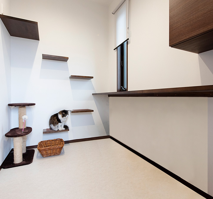 愛貓が家族の近くで過ごせるように、リビングの隣にペットスペースを設けました。キャットウォークや棚などを造作して、飽きのこない空間になるようにまとめています?!弗啸毳偿拴`に面しているので、風通しもいいです」。
