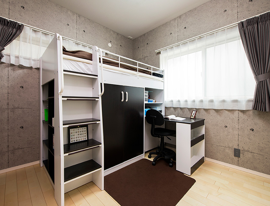 息子さまの部屋は、遊び心のあるクロスを採用?!袱长尾课荬违恁工献苑证沁xんでもらいました。新しい住まいも自分の部屋もとても気に入っています」とIさま。天井高を活かして、ロフトベッドもゆったりと配置できる空間となっています。