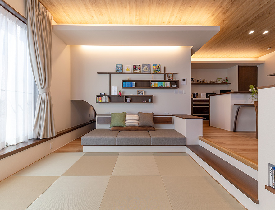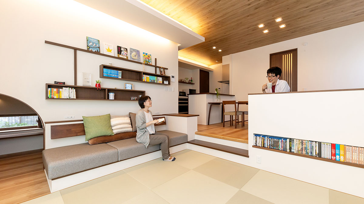 床を下げてさらなる天井高を出した畳敷のロースタイルリビング。大きなソファも造作し、ほっこりとくつろげる空間に。壁面の和モダンな「見せる本棚」には絵本や文庫本を飾って楽しんでいます。「畳に大の字に寢そべって、伸び伸びと読書ができるのがうれしくて」とKさまは微笑みます。