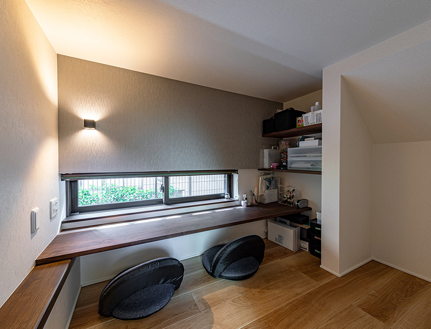 ロースタイルリビングのアール型の開口をくぐると、そこには階段下を利用した隠れ家のような雰囲気の空間が広がっています。ここはご夫妻の“おこもりスペース”。カウンター前の橫長窓からやわらかな光が差し込みます。「夜はホームバー気分で、二人で並んでお酒を楽しんでいます」とKさま。