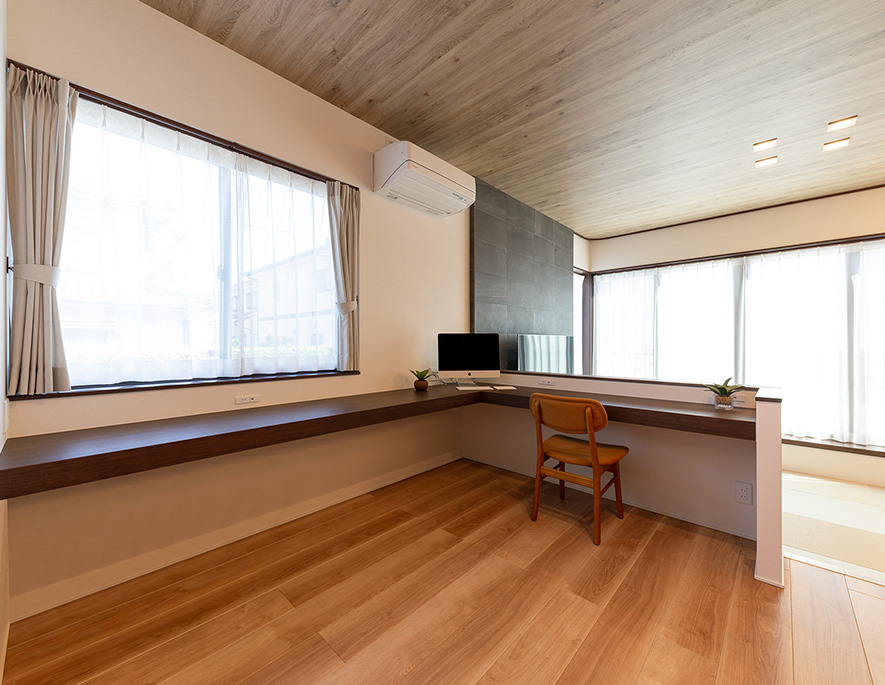 ダイニングの橫に造り付けたL字型カウンターは、仕事に趣味に家事スペースにと多彩に使えて便利です。「カウンターから畳敷のリビングを見下ろせるのもいいですね」とKさま。お子さまが生まれたら、將來はここが勉強スペースになりそうです。