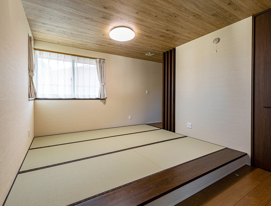 和モダンな暮らし方がお好みのご夫妻は、主寢室に小上がりのタタミスペースをしつらえて、お布団を敷いて寢るスタイルに。板張り調の天井が落ち著きを醸し出しています。木調格子の奧は書斎コーナーです。