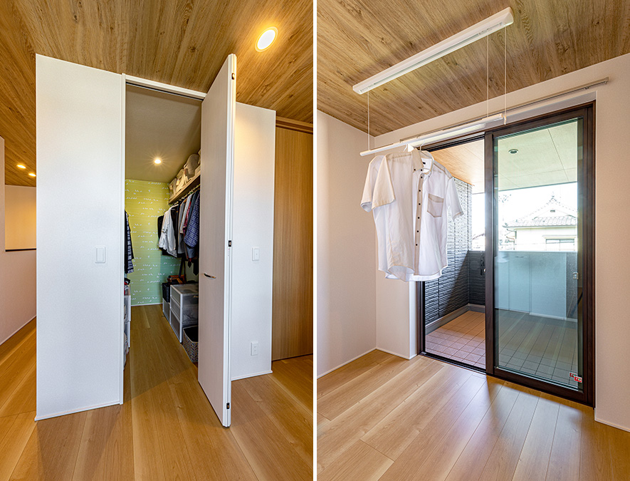 2階のバルコニーは物干し場としても大活躍。深い軒に守られており、ふいに雨が降りそうな日でも安心です。手前のホールに室內干しもでき、乾いた洗濯物は後ろのファミリークローゼットにサッとしまえるため洗濯家事がスムーズです。