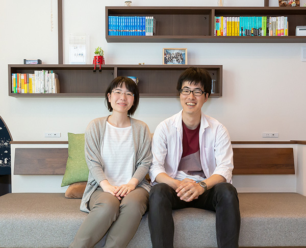ご結婚一年目のKさまは和モダンな暮らしがお好きな若いご夫妻。ロースタイルリビングを畳敷にすることで、限られた面積の中で「和室も大空間のLDKも両方ほしい」という希望を上手に実現されました。また、リビングの「見せる本棚」にお気に入りの蔵書を飾り、階段の踴り場を「我が家の図書コーナー」にするなど、読書好きのお二人らしいこだわりの造作も見どころです。「趣味が満喫できる夢のインドア生活が実現できたので、休日もあまり外出しなくなりました」と笑顔で語るKさまです。