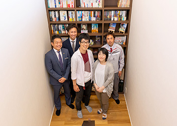 ご予算內で理想の家づくりを実現するための參考になるよう、さまざまな分譲住宅を実際に見ていただきました。お打ち合わせでは『xevoΣ』の実例集をお見せしながらご夫妻のお好みのイメージを把握し、プランに反映していきました。また、ご夫妻ともに本がお好きですので、お手持ちの蔵書の種類などをお伺いして踴り場の大きな本棚やリビングの飾り棚「見せる本棚」をご提案しました。