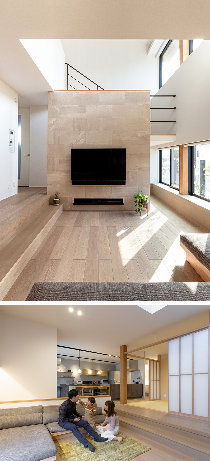 吹き抜けからが降り注ぐ光に包まれたロースタイルリビング。タイル調の調濕壁材を張った仕切り壁にテレビをすっきりと設置。「一段低い空間なので、より天井が高く感じられます。人が自然に集まりやすい雰囲気で、友人を大勢招いたときも段差に腰掛けて気軽にくつろいでもらえました」とTさま。