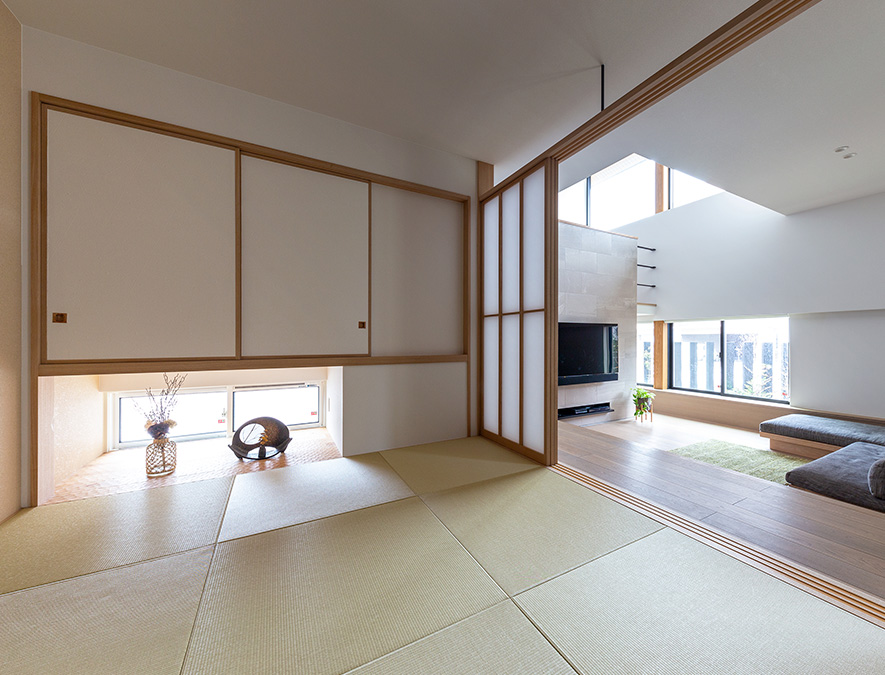 LDKの一角に設けた和室は吊り鴨居で天井を通して軽やかな雰囲気に。モダンなデザインの障子で和と洋が美しく調和。障子を閉めると個室になり、客間として使えます。「子どものお晝寢や、赤ちゃん連れのママ友が授乳するときなどにも重寶しています」とTさま。