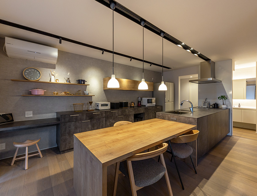 エイジングされた風合いのキッチンと溫かみのあるオーク柄のテーブルの組み合わせがスタイリッシュな北歐テイストのダイニングキッチン。天井を走る掘り込みのスリット照明の黒いラインがアクセントになって空間を引き締めています。キッチン背面収納の続きに家事カウンターも設けました。