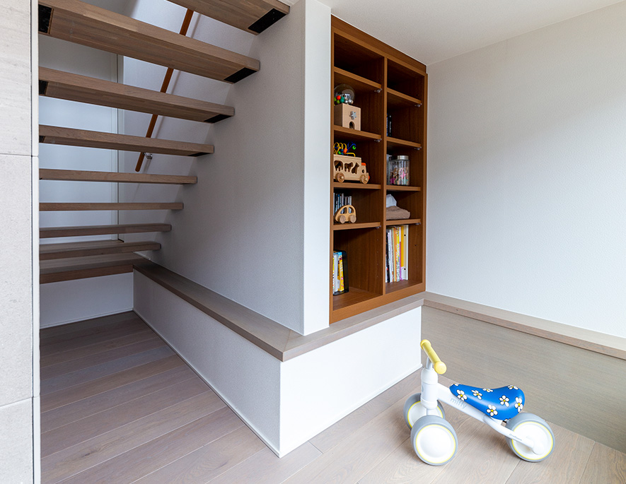 階段下を活用したロースタイルのおこもりスペース。壁に本棚を造り付けてご家族のライブラリーに。お子さまの遊び場にもぴったり。「玩具のブロックを積み上げたり、絵本を読んだり、いつもここで遊ばせています。段差で玩具が外に散らからないので、お片付けのストレスもありません」とTさま。