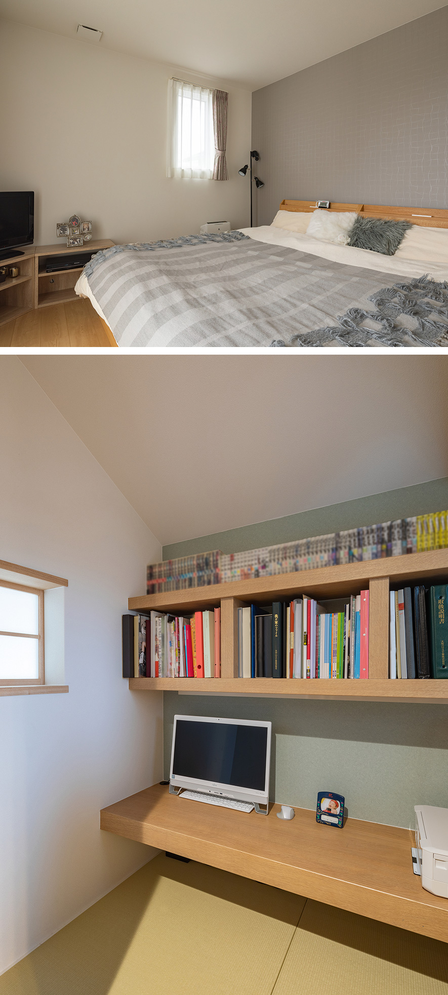 寢室はグレーのアクセントクロスで安らぎを感じるインテリアに。寢室の続きに勾配天井の低い側を利用して畳敷きの書庫スペースをつくり、カウンターと本棚を造り付けに。「インターネットカフェの個室空間のような雰囲気で、一人だけの時間が過ごせて、読書やパソコン作業がはかどります」とTさま。