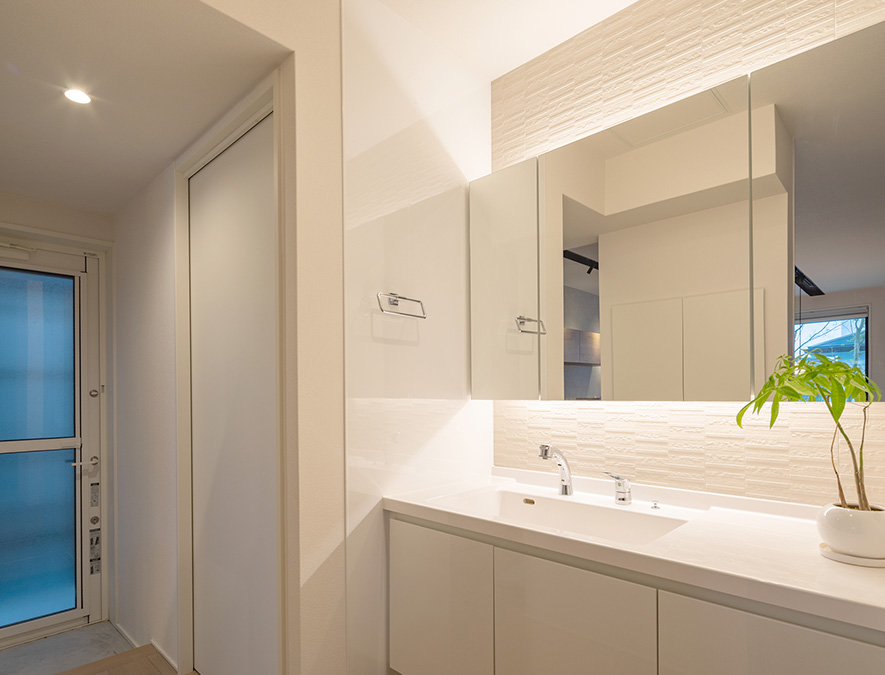 キッチンの壁の後ろに設けた洗面スペース。ミラー収納の上下から間接照明のあかりが拡散し、白い調濕壁材を美しく彩ります。「キッチンと行き來しやすくて家事動線も便利ですし、脫衣室と引戸で仕切っているので、來客時や誰かが入浴中でも洗面化粧臺が気兼ねなく使えます」とTさま。