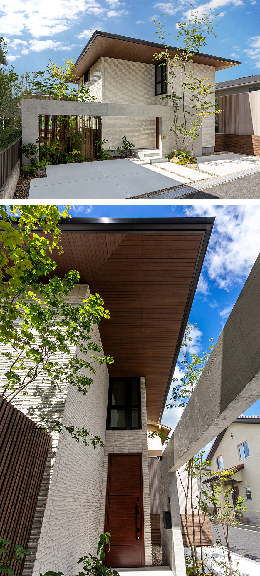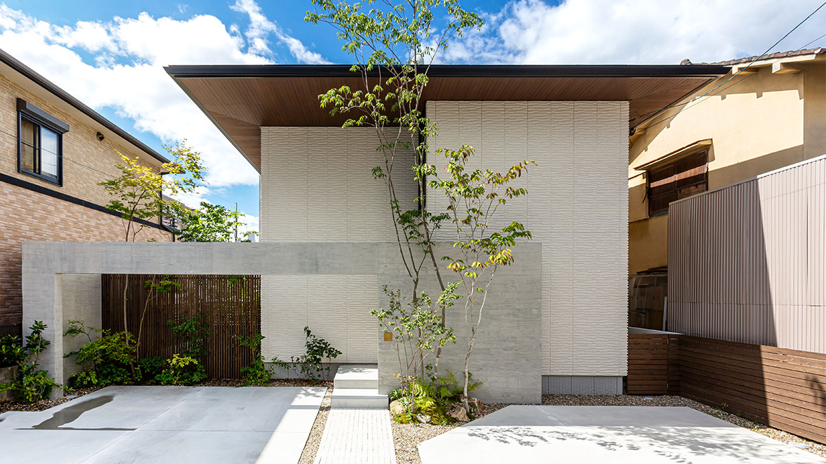 水平?垂直のラインやシンプルな壁面が凜とした美しさを放つ外観。深彫りの白い外壁に軒天の木地色が映え、大きく張り出した軒の出が玄関庇の役割も果たしています。外観を引き立てるコンクリート風(fēng)のゲートは特殊発泡素材で製作したもの。高く伸びる樹木や格子の向こうに透ける庭の緑が彩りを添えています。