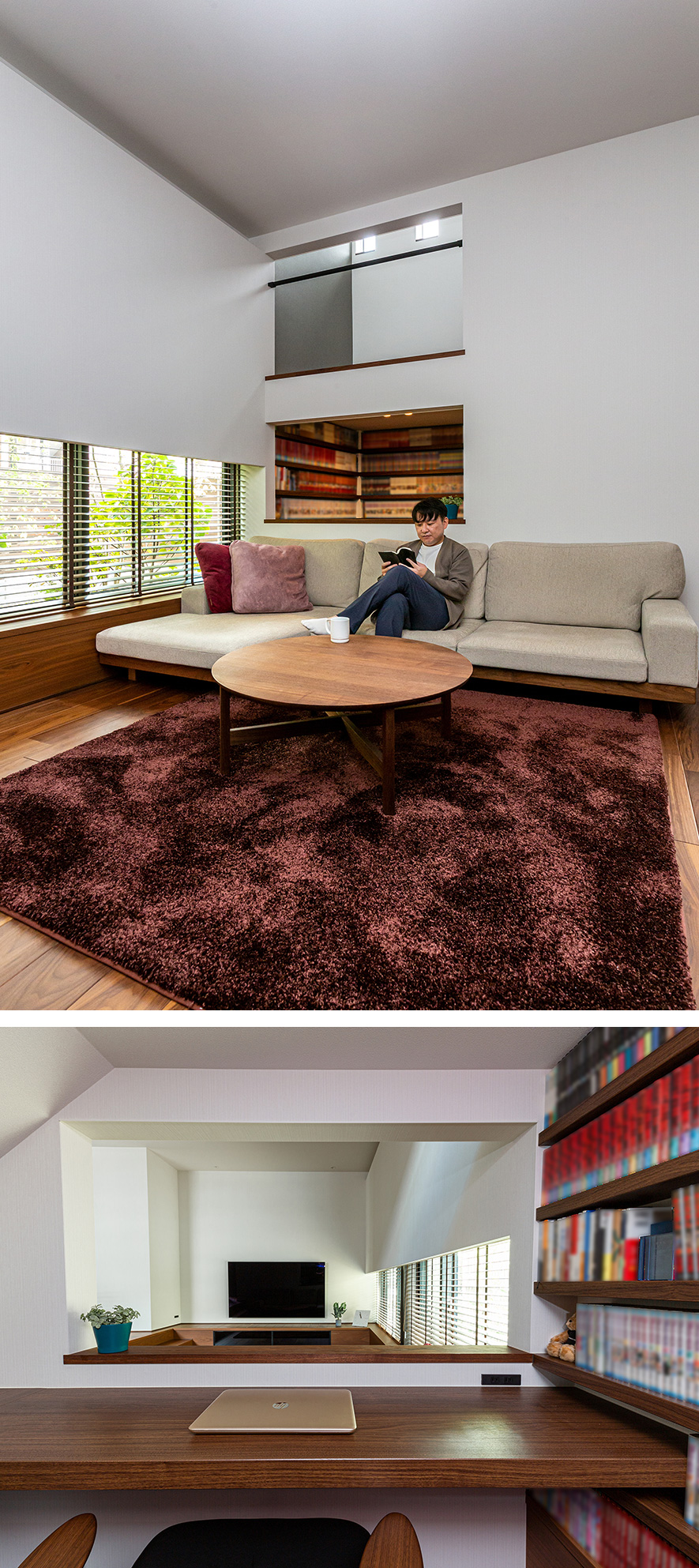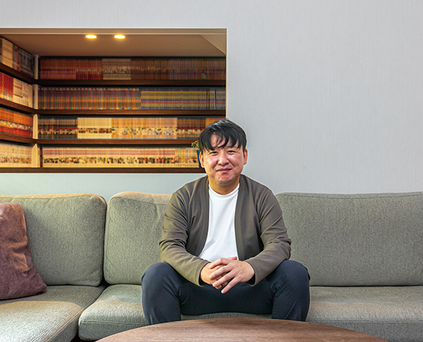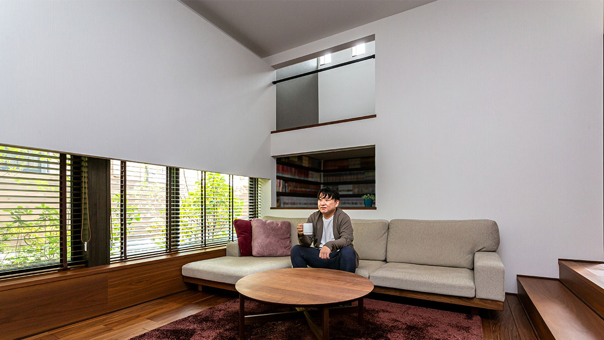 リビングはロースタイルにして別空間のような落ち著きを。「リビングに下りると気分が変わってリラックスできます。床が下がった分、天井がより高くなるのも気持ちいいですね」とYさま。大きな開口でつながる隣の書斎スペースは漫畫がお好きなYさまの趣味空間。壁一面の本棚にコミック本を整然と並べています。