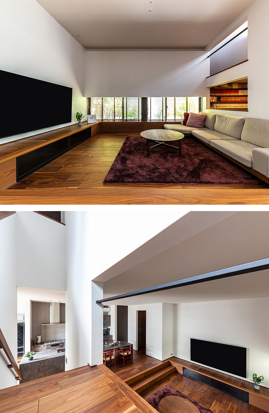建物が隣接するロースタイルリビングの東側(cè)は、上部を壁で覆って外界を遮斷しながらも、橫に広がる地窓から光を招き入れ、樹木の緑がゆらぐ庭の景色を美しく切り取っています。書斎の上の大きな開口は階段の踴り場。ここに座ってリビングを眺められる遊び心のあるデザインもYさまのお?dú)荬巳毪辘扦埂?/p>