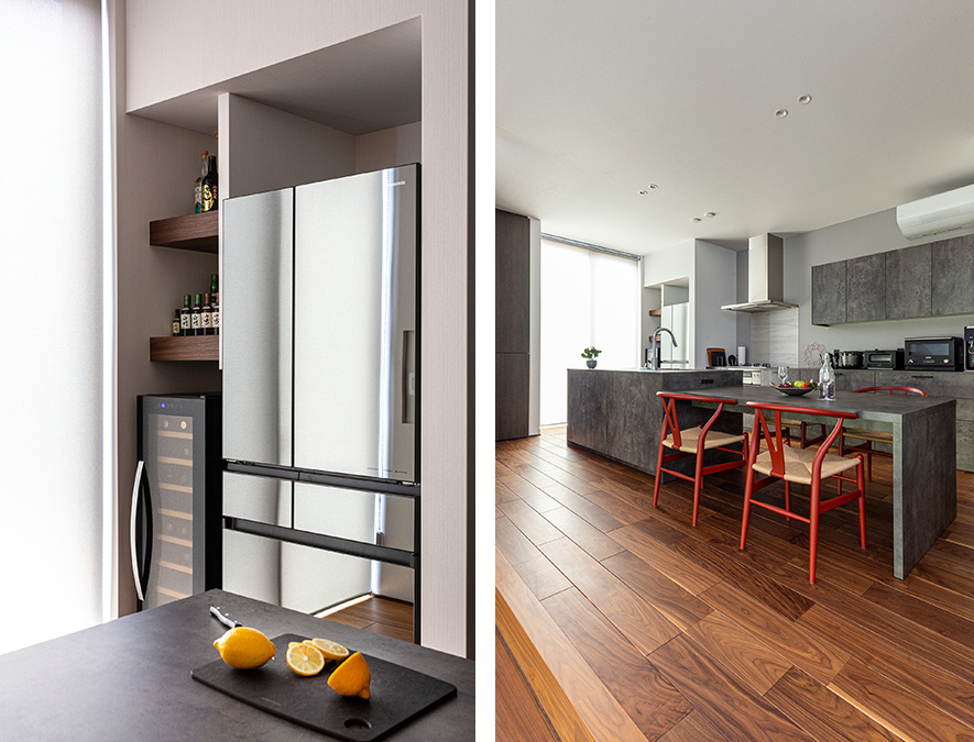 冷蔵庫やワインセラーも壁面にすっきり