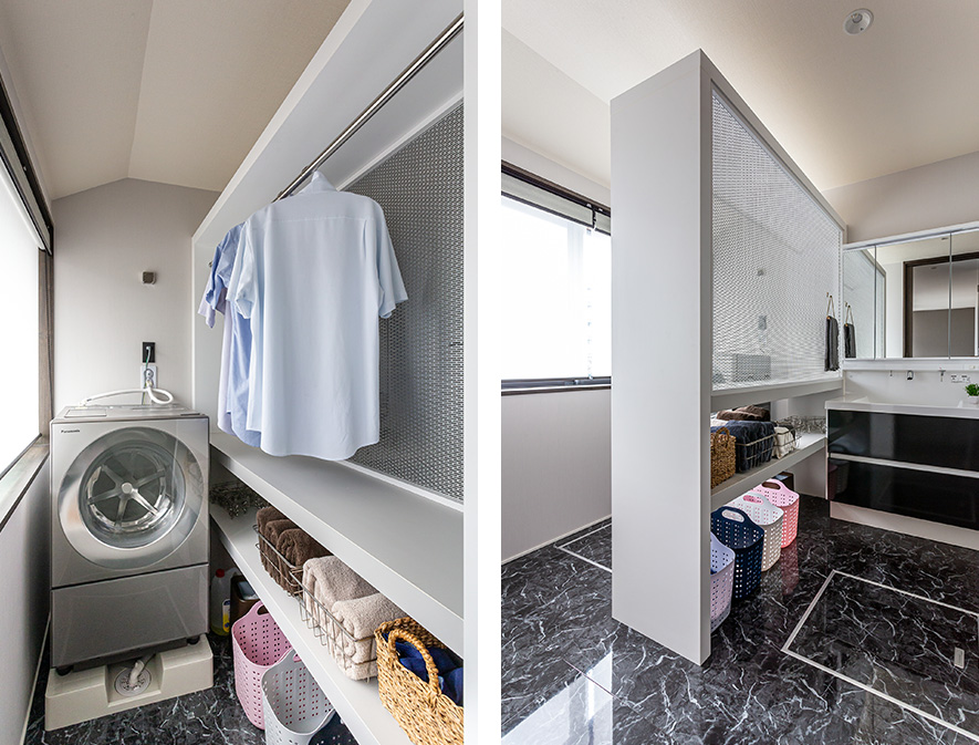 白×黒でコーディネートした清潔感あふれる洗面室。中央に両サイドから使える棚を造り付けて、ランドリースペースとほどよく間仕切りをしました。日當(dāng)たりがよく、室內(nèi)干しでも洗濯物がよく乾くそう。棚の壁面にはパンチングメタルを用いて、窓からの視線を遮りつつ、洗面室へと光を透過させています。
